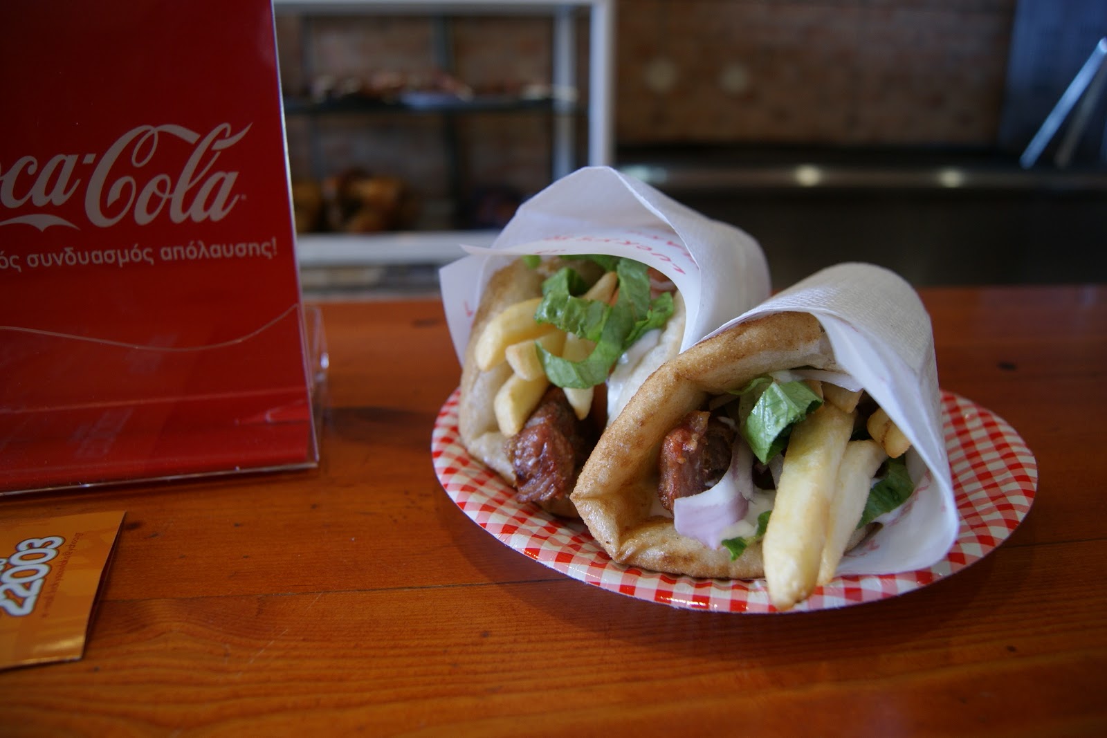 On the first day, since we were quite exhausted, we decided to just visit the town we were staying at. It was also the capital of Santorini - Thira (or Fira). Unfortunately, it started POURING and we got drenched, soaked etc. My shoes are still soaked :'( So here are some photos we took on the second day of the capital :) but beforeeee, we had lunch at a place called Lucky's Souvlakis. Souvlaki is like a Greece thing (food), it's like meat on a stick. We have Souvlaki Pita (souvlaki in pita bread with some veggie and chips). It was VERY yummy :D